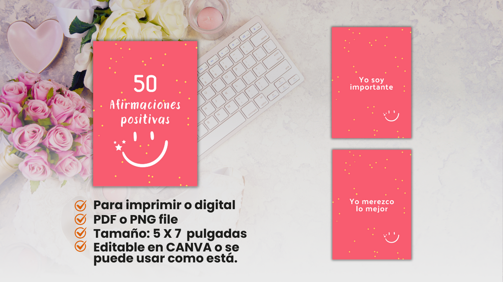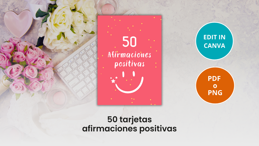 50 tarjetas de afirmaciones positivas. Formato PDF/PNG. Editable en CANVA