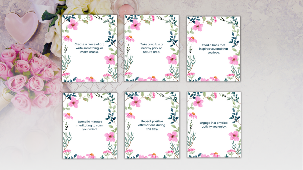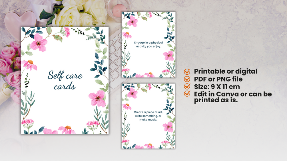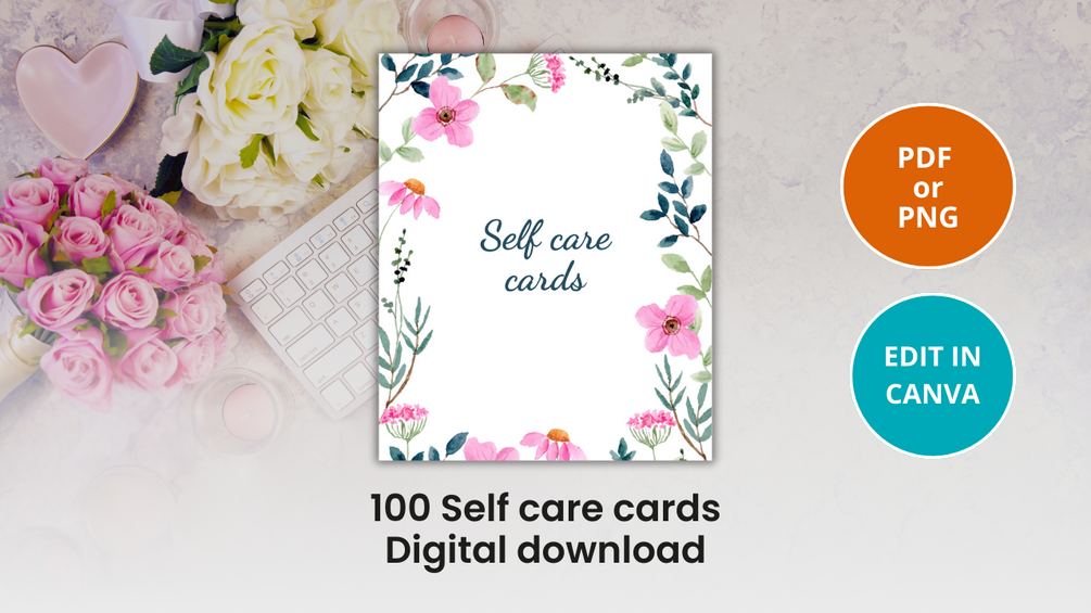 Self care cards. Printable / Canva template Do you want to start a journey of self-knowledge and self-love? These cards will allow you to transform your life in many areas, and will help you see significant changes in a short time. These cards are 100% editable in CANVA, you can change the color, fonts or elements. You can also use them as they are if you like.