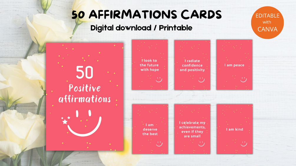 These cards are 100% editable in CANVA, you can change the color, fonts or elements. You can also use them as they are if you like. ★ 50 modern affirmation cards ★ 5x7 inches ★ Edit in Canva using a free or pro account, then print at home or work or at a print shop.